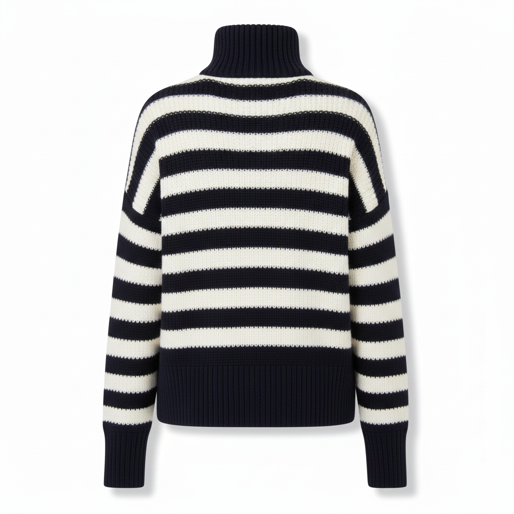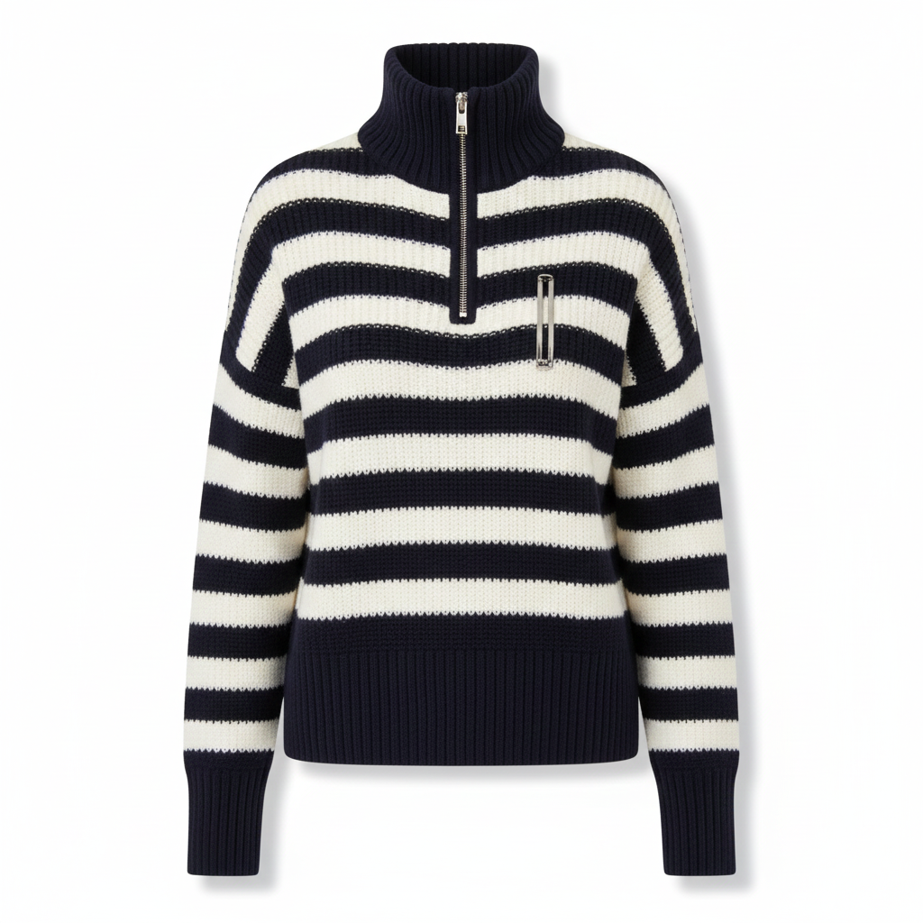 Ce pull est un modèle à rayures horizontales contrastantes sur le corps et les manches. Il est doté d'une fermeture éclair à mi-hauteur au niveau du col montant. Les poignets, le col et l'ourlet sont finis par une large côte serrée qui contraste joliment avec la maille.